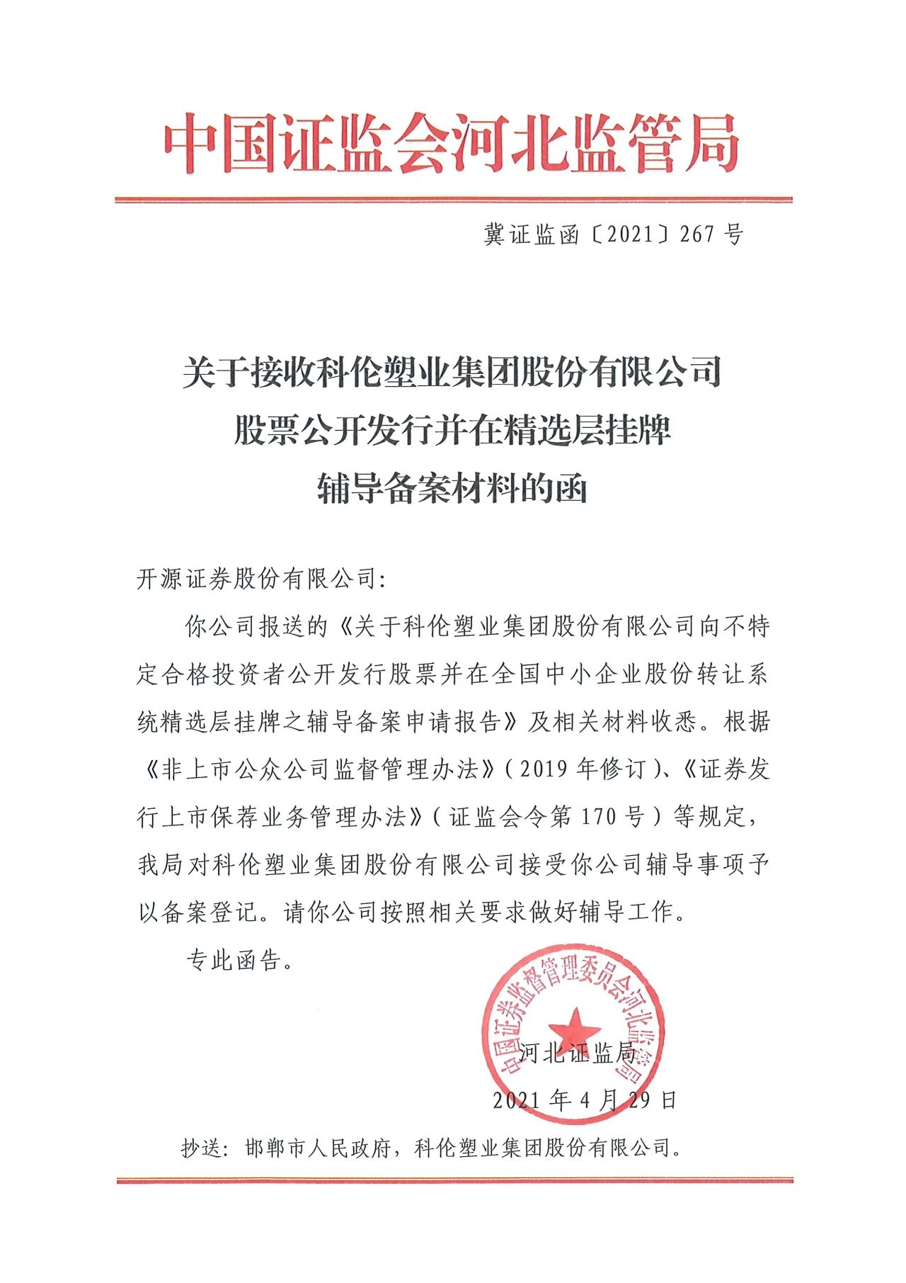 中國證監(jiān)會河北監(jiān)管局批準開源證券對科倫塑業(yè)集團進行上市輔導(dǎo)